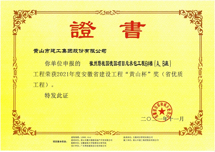 由黃山建工集團(tuán)承建的徽州區(qū)碧桂園德園項(xiàng)目總承包工程6#樓(A、B座) 工程榮獲安徽省工程質(zhì)量最高獎(jiǎng)“黃山杯”獎(jiǎng)。該工程在開工伊始,項(xiàng)目部就制訂了創(chuàng)優(yōu)目標(biāo),嚴(yán)格過程控制,建立健全項(xiàng)目質(zhì)量管理體系,狠抓現(xiàn)場施工管理,把好施工過程質(zhì)量控制關(guān),為創(chuàng)精品工程打下堅(jiān)實(shí)的基礎(chǔ)。