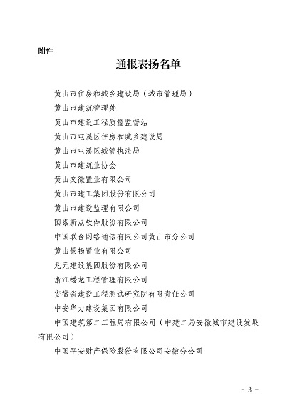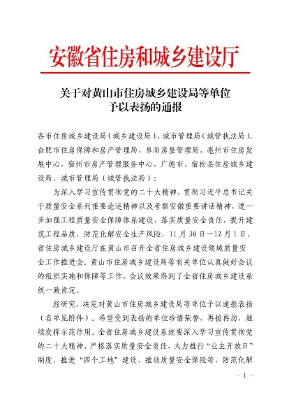 近日,安徽省住房和城鄉(xiāng)建設(shè)廳印發(fā)《關(guān)于對黃山市住房和城鄉(xiāng)建設(shè)局等單位予以表揚(yáng)的通報(bào)》,《通報(bào)》指出,11月30日-12月1日,省住房和城鄉(xiāng)建設(shè)廳在黃山市召開全省住房建設(shè)領(lǐng)域質(zhì)量安全工作推進(jìn)會,會議效果得到全省住房城鄉(xiāng)建設(shè)系統(tǒng)一致肯定,并對在此次會議認(rèn)真做好組織實(shí)施和保障的單位予以通報(bào)表揚(yáng),黃山市建工集團(tuán)股份有限公司作為唯一一家本土建筑施工企業(yè)榮獲表揚(yáng)。