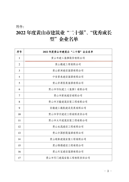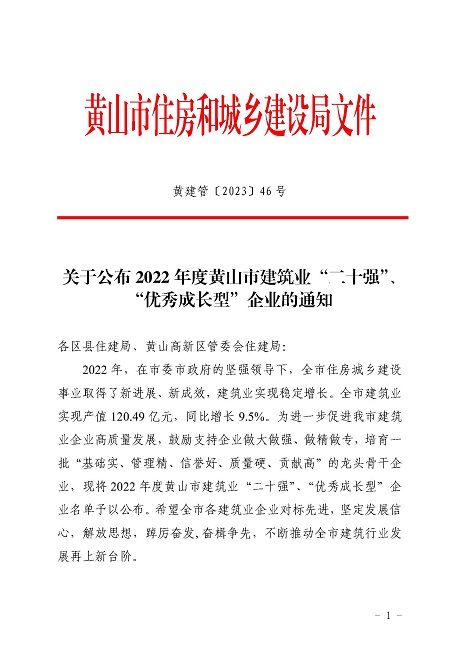 近日,黃山市住房和城鄉(xiāng)建設局發(fā)布的《2022年度黃山市建筑業(yè)二十強企名單》中,黃山建工集團股份有限公司榮獲2022年“黃山市建筑業(yè)企業(yè)二十強”。