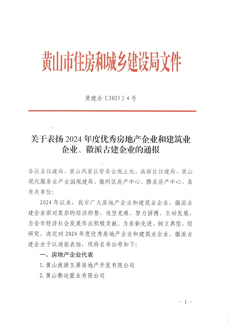 近日,黃山市住房和城鄉(xiāng)建設(shè)局發(fā)布了《關(guān)于表揚(yáng)2024年度優(yōu)秀房地產(chǎn)企業(yè)和建筑業(yè)企業(yè)、徽派古建企業(yè)的通報》,黃山建工集團(tuán)榮獲2024年度優(yōu)秀建筑業(yè)企業(yè)稱號。