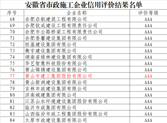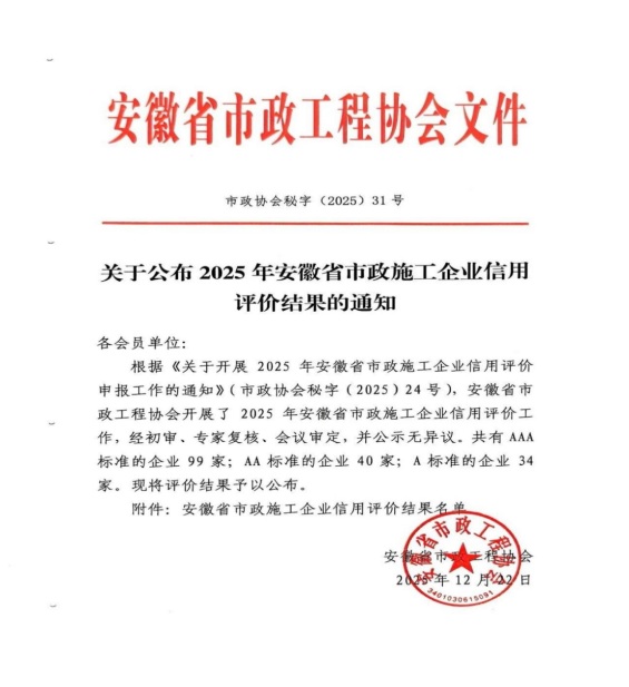 近日,安徽省市政工程協(xié)會正式發(fā)布《關(guān)于公布2025年安徽省市政施工企業(yè)信用評價結(jié)果的通知》。黃山市建工集團(tuán)憑借卓越的綜合實(shí)力、規(guī)范的市場行為、優(yōu)良的工程品質(zhì)及堅(jiān)實(shí)的信用體系建設(shè),成功獲評最高信用等級——AAA級。標(biāo)志著集團(tuán)在誠信經(jīng)營、履約能力與社會責(zé)任履行方面獲得了行業(yè)主管部門與協(xié)會的高度認(rèn)可,是企業(yè)信用建設(shè)領(lǐng)域的又一重要里程碑。