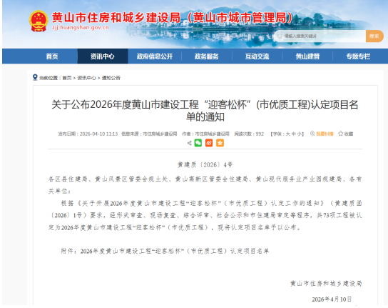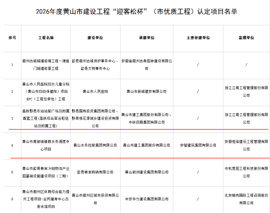 近日,黃山市住房和城鄉(xiāng)建設(shè)局正式發(fā)布《關(guān)于公布2026年度黃山市建設(shè)工程“迎客松杯”(市優(yōu)質(zhì)工程)認(rèn)定項(xiàng)目名單的通知》。由黃山建工集團(tuán)承建的高鐵黟縣東站站前廣場(chǎng)及附屬配套工程、仙人洞南路東側(cè)D1地塊(文瀾軒)-4#樓以及黃山市南部城鎮(zhèn)群水務(wù)調(diào)度中心項(xiàng)目憑借過(guò)硬的施工質(zhì)量和卓越的工程品質(zhì),成功通過(guò)最終審定,認(rèn)定為2026年度黃山市建設(shè)工程“迎客松杯”(市優(yōu)質(zhì)工程)。這也是集團(tuán)連續(xù)多年獲得該殊榮。