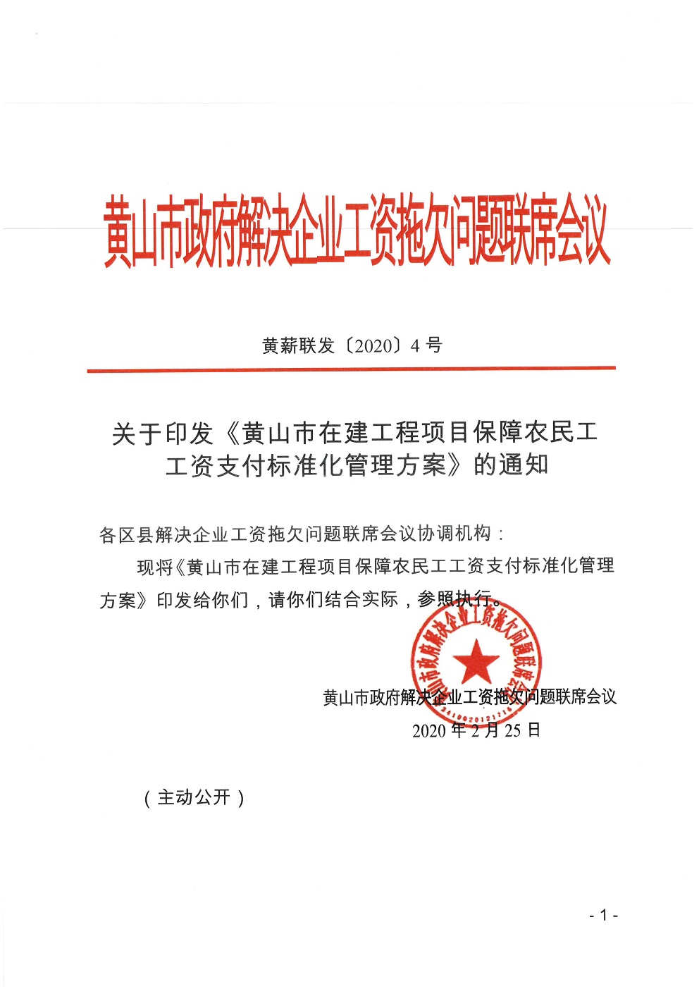關(guān)于印發(fā)《黃山市在建工程項(xiàng)目保障農(nóng)民工工資支付標(biāo)準(zhǔn)化管理方案》的通知.doc